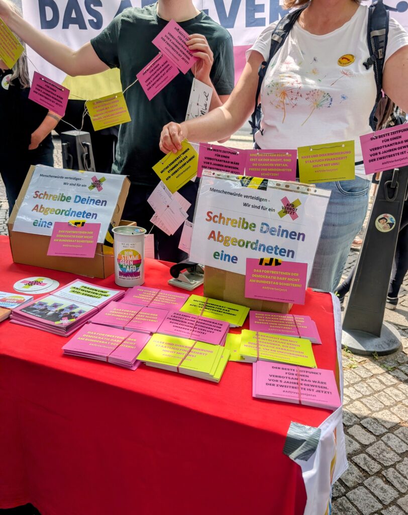 Wir fordern die Mitglieder des Niedersächsischen Landtags auf, im Niedersächsischen Landtag einen Antrag einzubringen, in dem die niedersächsische Landesregierung aufgefordert wird, sich auf Bundesebene für die umgehende Einleitung eines AfD-Verbotsverfahrens einzusetzen. Konkret soll die Landesregierung in Gesprächen mit der Bundesregierung auf ein Verbotsverfahren hinwirken und parallel dazu in Absprache mit anderen Bundesländern umgehend eine Bundesratsinitiative zur Einleitung eines AfD-Verbotsverfahrens einbringen.